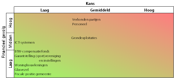 In deze tabel zijn de meest risicovolle onderwerpen met een groot financieel gevolg rechtsboven gesitueerd (rood). Van rechtsboven naar linksonder (groen) neemt voor de verschillende onderwerpen zowel de kans als het financieel gevolg van het risico steeds verder af.