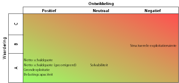 In onderstaande tabel zijn de vijf kengetallen geclassificeerd. Links (verticaal) wordt de waardering van het kengetal weergegeven, waarbij A gunstig betekent, B is neutraal en C is ongunstig. Boven (horizontaal) geeft het verloop van het kengetal weer. Zo is te zien of het kengetal zich al dan niet goed ontwikkelt in meerjarenperspectief.