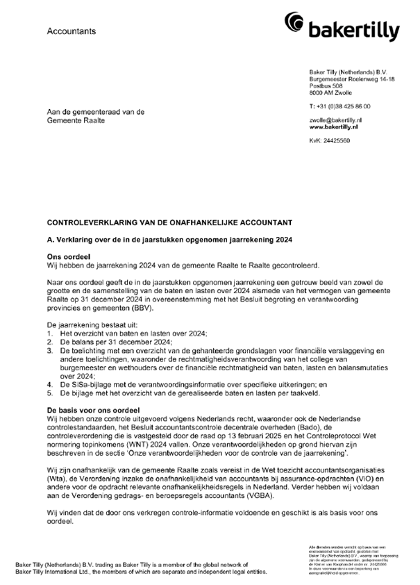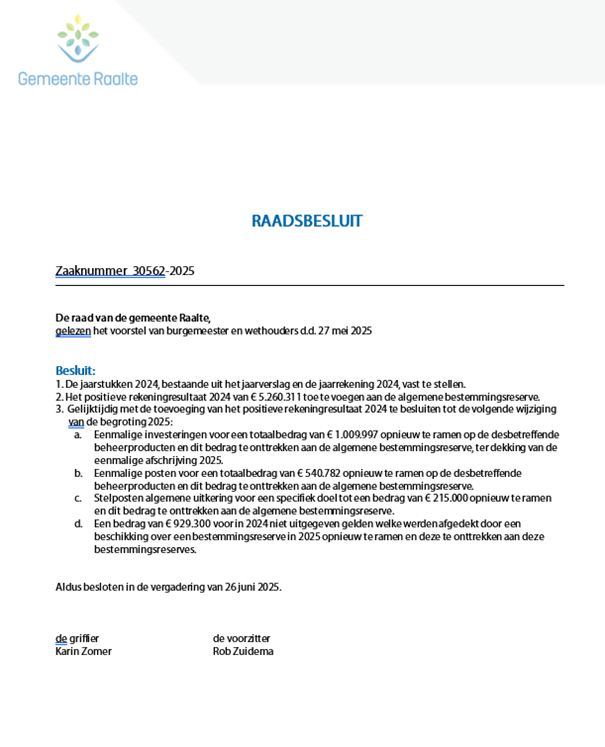Burgemeester en wethouder van de gemeente Raalte verklaren, dat de jaarstukken 2024 zijn opgemaakt op 27 mei 2025 en op 29 mei 2025 zijn overlegd aan de raad en via de website (raalte.nl ) zijn gepubliceerd.